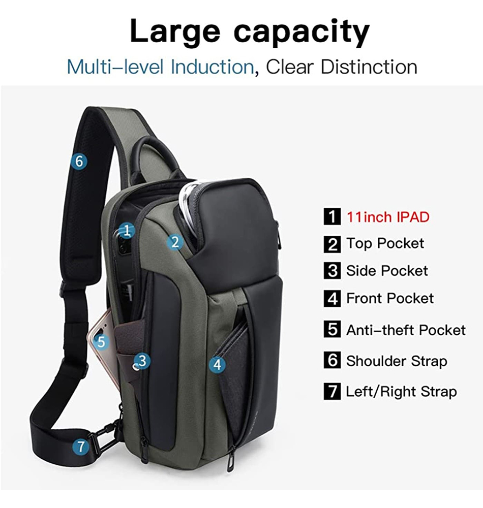 Η κύρια τσέπη μπορεί να χωρέσει 1 μπλουζάκι ή ένα βιβλίο Β5 ή μία διπλωμένη ομπρέλα ή ένα μπουκάλι νερού 500ml, εσωτερικό διαμέρισμα ipad 11" ιντσών . Υπάρχει μαι μεγάλη υποδοχή για καθημερινά είδη πρώτης ανάγκης που μπορείτε να φτάσετε γρήγορα, και στο εσωτερικό υπάρχει επίσης μια τσέπη με φερμουάρ για πολύτιμα πράγματα. Δύο υποδοχές στο εσωτερικό βοηθούν στην οργάνωση των πραγμάτων.