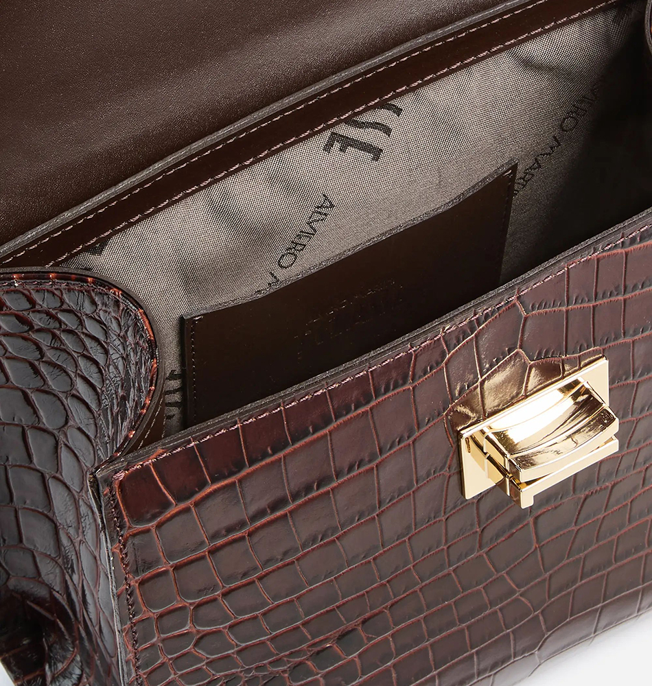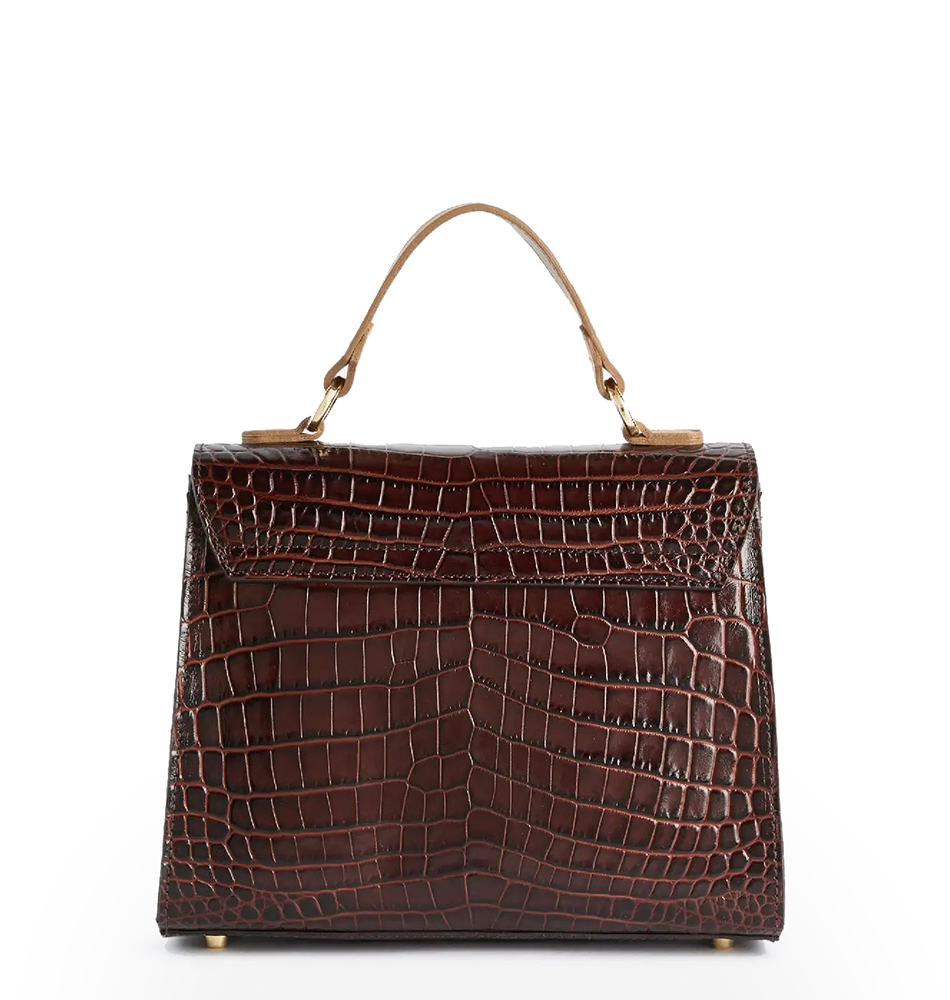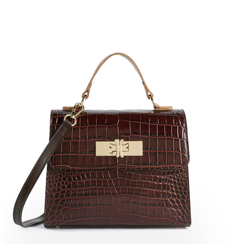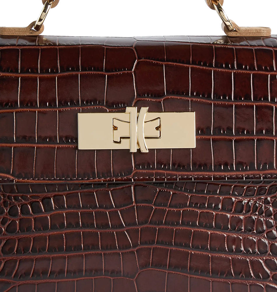 Τσαντάκι χειρός χιαστί Alviero Martini 1A Classe Elegance Mini Tote Mahogany LLD60-M645-0529 Καφέ. Το γυαλιστερό δέρμα με εφέ κροκό αναδεικνύει υπέροχα την πλούσια απόχρωση Mahogany, προσδίδοντας πολυτελή αίσθηση στην mini tote τσάντα Elegance Bag. Το νέο κούμπωμα με περιστρεφόμενο λογότυπο 1C, σε χρυσή απόχρωση, θυμίζει τετράφυλλο τριφύλλι — σύμβολο καλής τύχης που αποτυπώνει τη παιχνιδιάρικη διάθεση της συλλογής. Συμπαγής αλλά ευρύχωρη, χάρη στη δομή της, διαθέτει χερούλι από ύφασμα με εφέ napa και μοτίβο Geo Classic, καθώς και ρυθμιζόμενο, αποσπώμενο λουράκι από λείο δέρμα. Μια κομψή και μοντέρνα τσάντα που ολοκληρώνει με στυλ κάθε χειμερινό look.