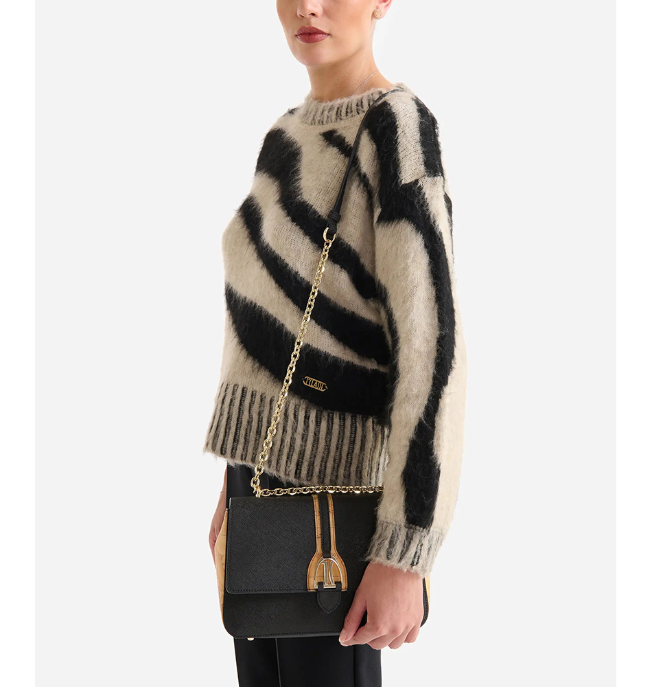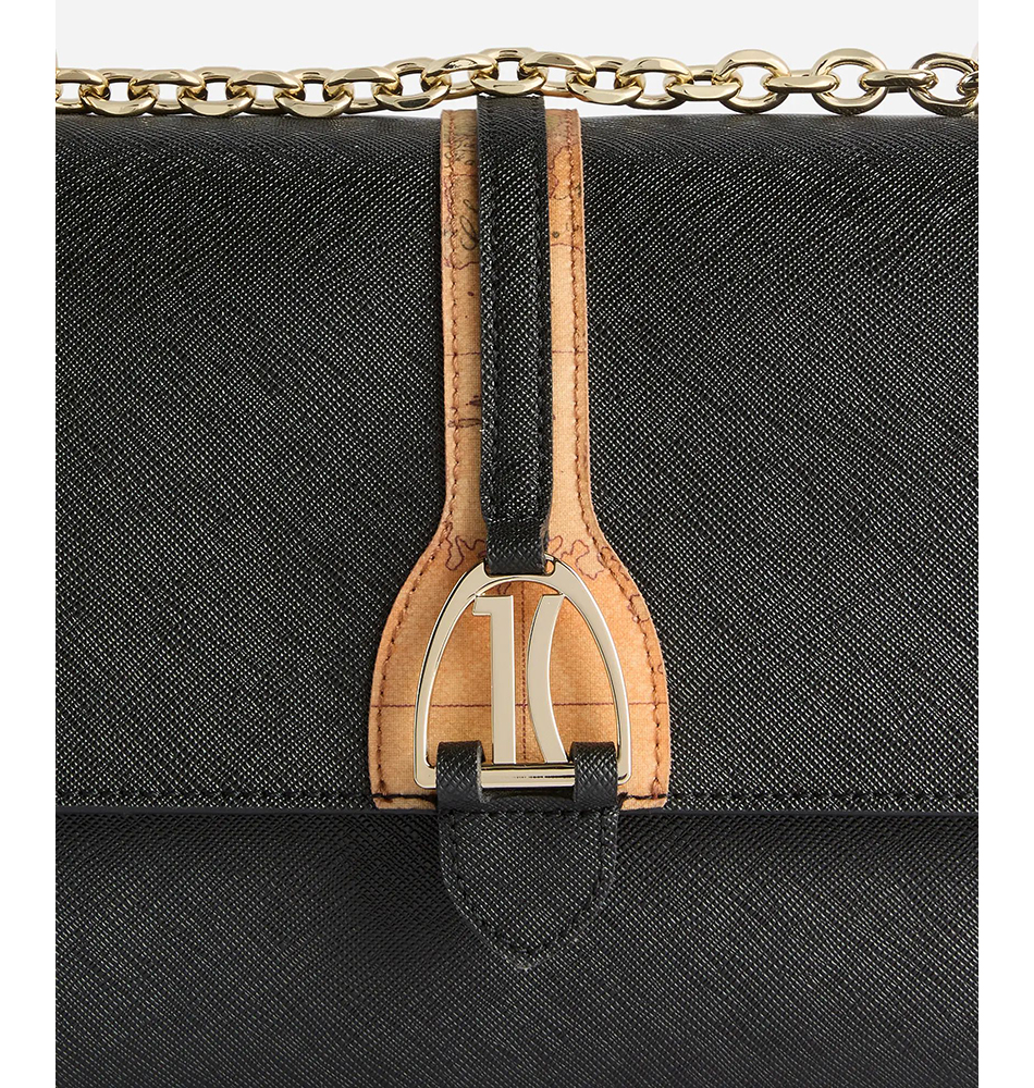 Γυναικεία τσάντα ώμου/χιαστί me αλυσίδα Alviero Martini 1A Classe Horsy Bag LLD57-T407-0001 Μαύρο. Η τσάντα με πτερύγιο από ύφασμα Saffiano αγκαλιάζει τη συλλογή Destiny Land και γίνεται η νέα Horsy Bag. Το πτερύγιο και το μαγνητικό κλείσιμο φέρουν ένα νέο στοιχείο στήριξης με το λογότυπο 1C σε συνδυασμό με ένα ύφασμα Geo Classic, συνδυάζοντας τα ιππικά μοτίβα της Σκωτίας με την κληρονομιά της μάρκας. Τα μαλακά πλαϊνά από ύφασμα Geo Classic την κάνουν ακόμα πιο ευρύχωρη, ενώ η αλυσίδα και ο ρυθμιζόμενος ιμάντας από ύφασμα Saffiano μπορούν να ανυψωθούν στο κέντρο για να φορεθεί στον ώμο. Μια πάντα αγαπημένη τσάντα που υιοθετεί ζεστούς τόνους για εμβληματικές εμφανίσεις που εναρμονίζονται με την φθινοπωρινή σεζόν.