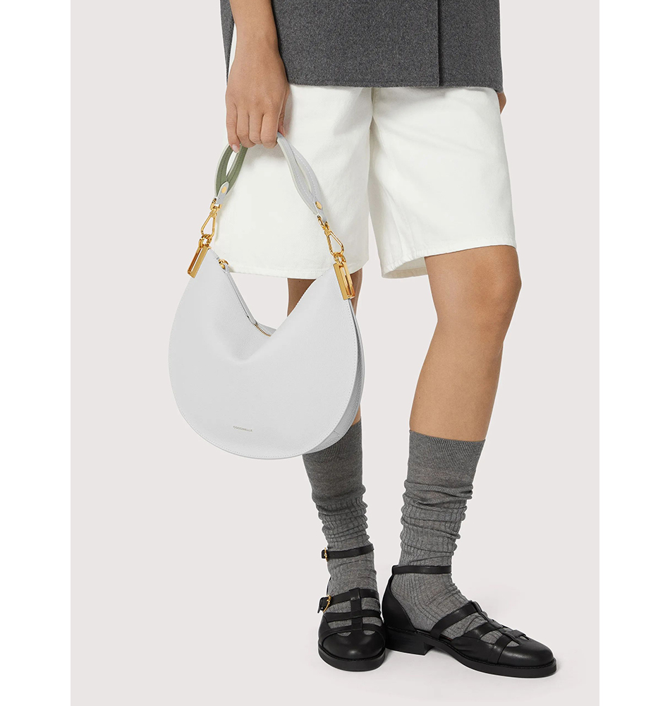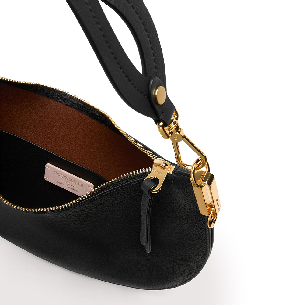 Η στρόγγυλη σιλουέτας της, που αντικατοπτρίζεται και στο όνομά της, είναι το σήμα κατατεθέν της σειράς Coccinelle Sunup. Η λαβή είναι το διακριτικό στοιχείο της σειράς, βασισμένη στις ίδιες θηλυκές καμπύλες που δημιουργούν μια ελικοειδή ύφανση, δίνοντάς της μια πινελιά πρωτοτυπίας. Το δέρμα δύο όψεων ενισχύει την απαλότητα και την ελαφρότητα της τσάντας, χάρη και στο εσωτερικό χωρίς επένδυση, προσθέτοντας μια πρωτότυπη πινελιά χάρη στο παιχνίδι των χρωματικών αντιθέσεων. Αυτό το μοντέλο είναι κατασκευασμένο με δέρμα που έχει υποστεί επεξεργασία με εξειδικευμένα μηχανήματα και στη συνέχεια έχει υποστεί αναδίπλωση για ένα εξαιρετικά απαλό φινίρισμα. Αυτός ο συγκεκριμένος τύπος δέρματος έχει φινίρισμα με χρωστικές ουσίες και στις δύο πλευρές για να δημιουργήσει ένα εφέ δύο όψεων. Είναι κατασκευασμένο από ένα ανθεκτικό υλικό, καθιστώντας το κατάλληλο για καθημερινή χρήση.