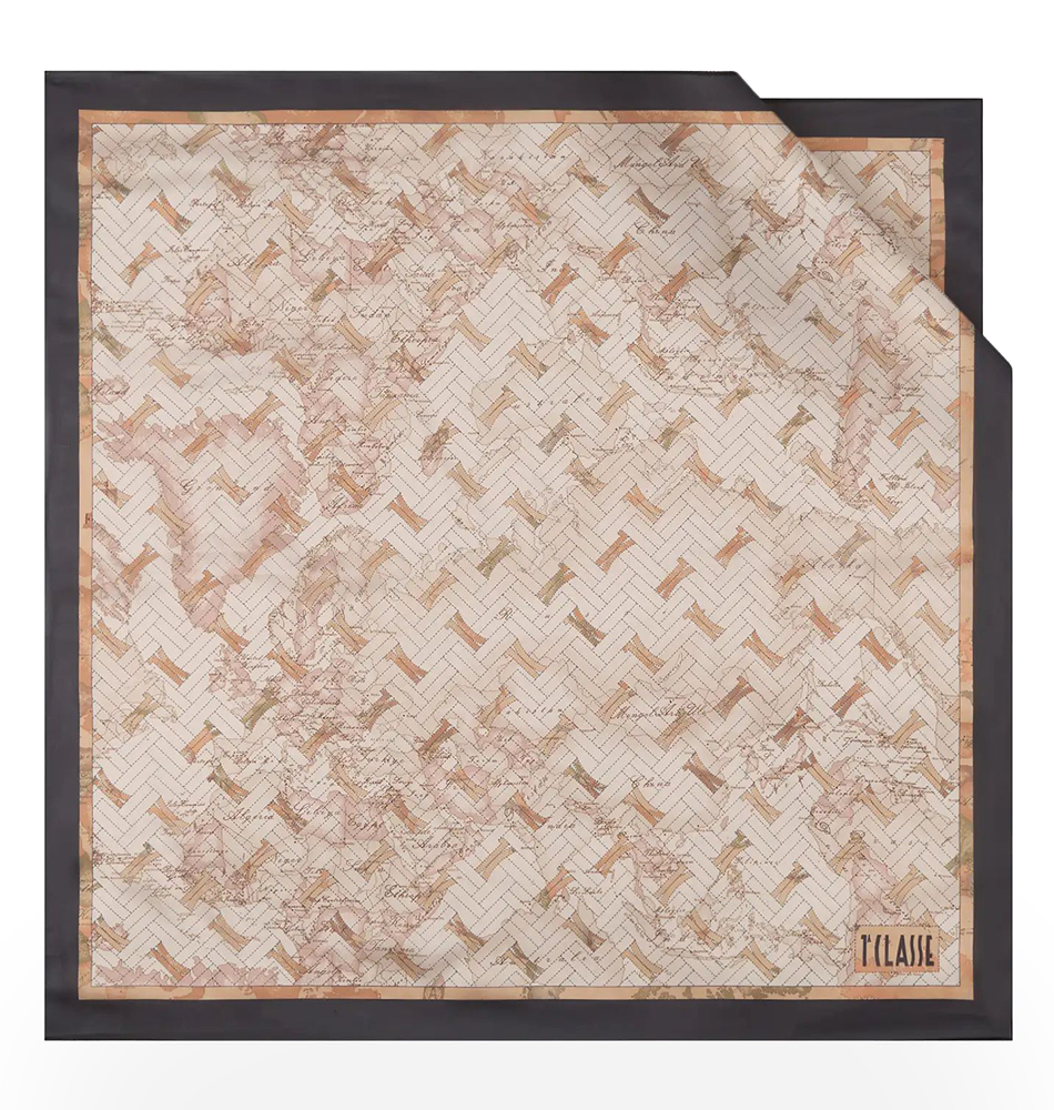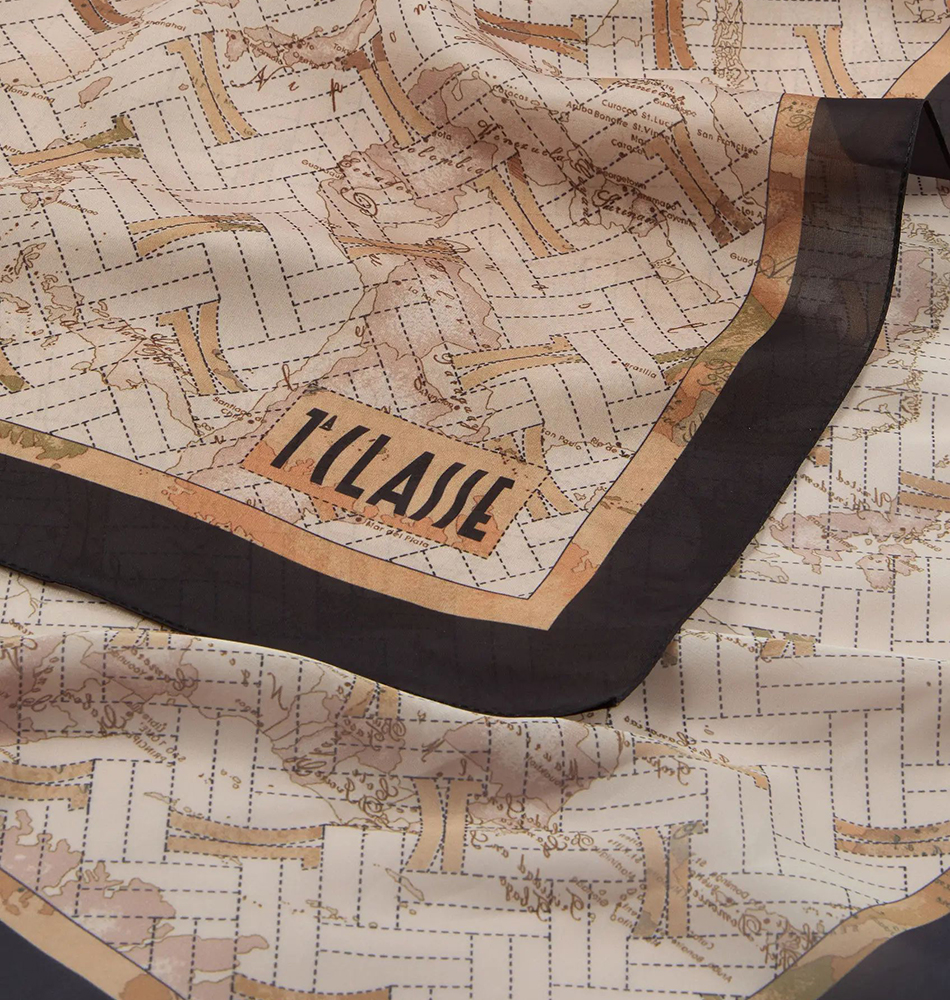 Γυναικείο μεταξωτό φουλάρι Alviero Martini 1A Classe 1C Matelassé KF113-1789-0001 Μαύρο. Το νέο μοτίβο 1C Matelassé συνδυάζει την κληρονομιά της μάρκας με τα χαρακτηριστικά μοτίβα των σκωτσέζικων υφασμάτων, δημιουργώντας ένα μοτίβο ψαροκόκαλο διακοσμημένο με λογότυπα 1C Geo Classic. Ο εμβληματικός χάρτης στο φόντο έχει απαλές αποχρώσεις, ενώ η λεπτομέρεια του πλαισίου σε αντίθεση προσθέτει μια πινελιά χρώματος.