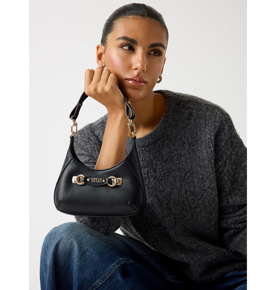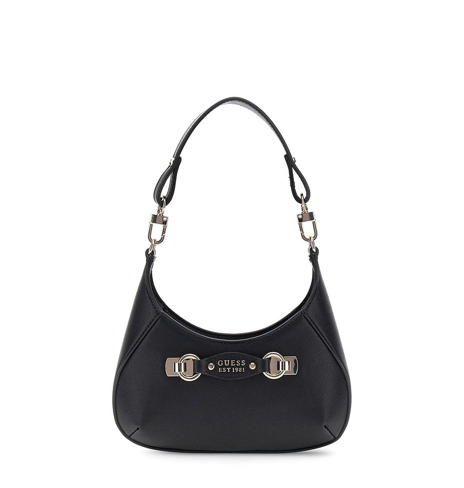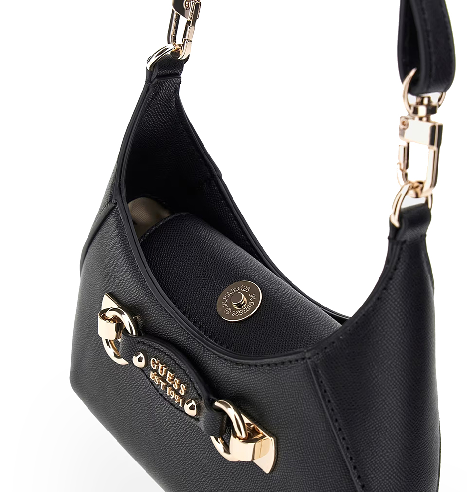Γυναικεία τσάντα ώμου Guess Mimina Mini Top Zip HWBG8015720-BLΑ Μαύρο. Η Guess Mimina είναι μια κομψή και μίνιμαλ τσάντα ώμου, ιδανική για καθημερινές αλλά και βραδινές εμφανίσεις. Το μεταλλικό διακοσμητικό στο μπροστινό μέρος προσθέτει μια πολυτελή πινελιά, ενώ το compact μέγεθος την κάνει πρακτική και εύκολη στο στυλάρισμα.