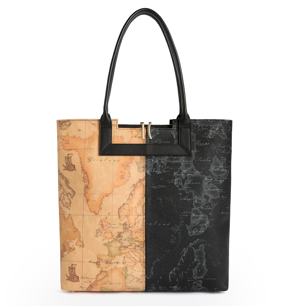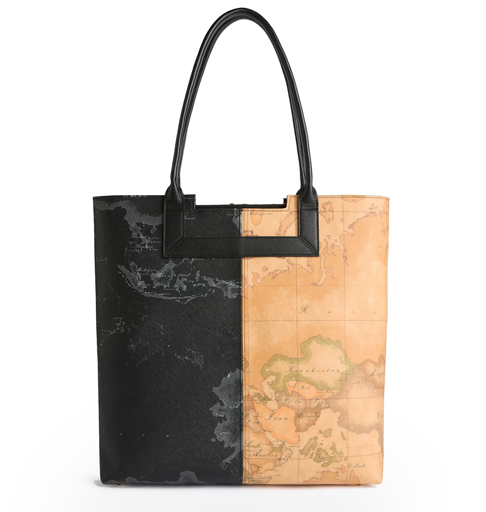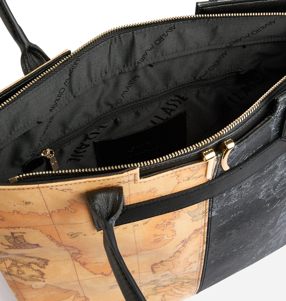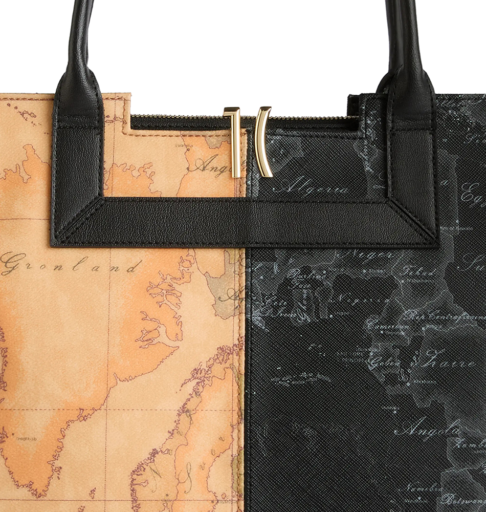 Γυναικεία τσάντα χειρός Alviero Martini 1A Classe Eclipse Geo LMLE23-MIXG-S698 Μαύρο. Οι δύο όψεις του εμβληματικού χάρτη Geo καθορίζουν την τσάντα Eclipse Geo shopper: τα δύο μισά, το ένα σε ύφασμα Geo Classic και το άλλο σε Geo Night, ενώνονται με μια μαύρη λεπτομέρεια από faux δέρμα που αντικατοπτρίζει το επάνω μέρος της τσάντας και συνεχίζεται στα χερούλια. Το αποτέλεσμα είναι ένας αρμονικός, γεωμετρικός σχεδιασμός που πλαισιώνει το λογότυπο 1C σε απαλό χρυσό. Μαλακή και ευρύχωρη, με έξυπνες αντιθέσεις, προσδίδει έναν αποκλειστικό χαρακτήρα στα outfits της σεζόν.