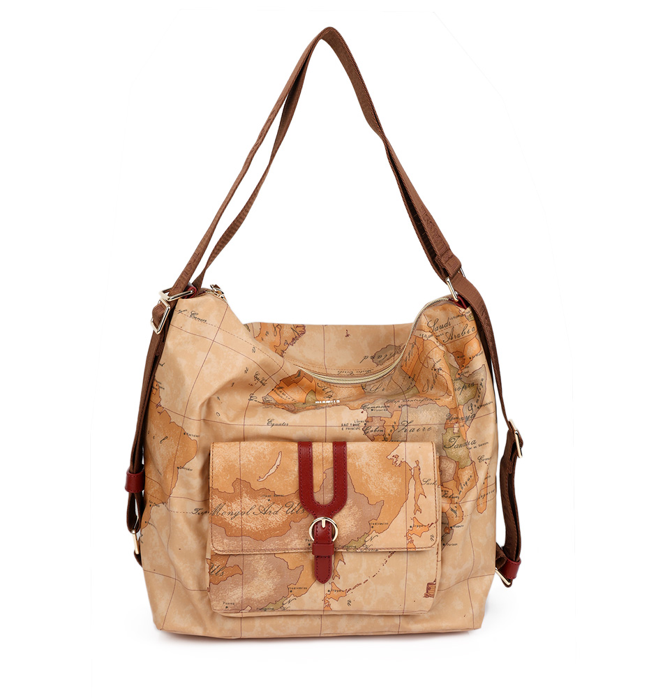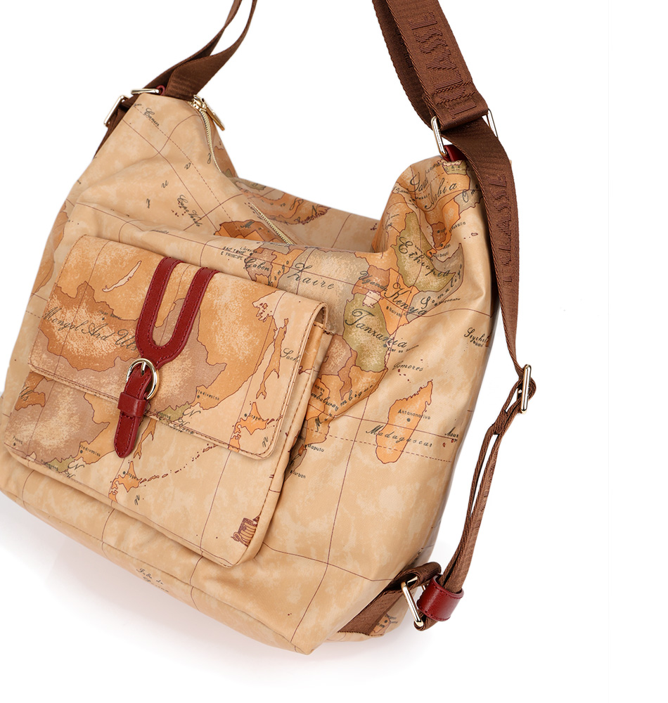 Γυναικεία τσάντα ώμου/πλάτης Alviero Martini 1A Classe Highland Dual Wearability LLD35-S578-0313 Κόκκινο. Τσάντα ώμου από μαλακό ύφασμα που τονίζει τον εξαιρετικά λειτουργικό χαρακτήρα της, αντλώντας έμπνευση από τα Highlands της Σκωτίας: χάρη στο μαλακό, αδιάβροχο υλικό και τη διπλή δυνατότητα μεταφοράς, στον ώμο ή ως σακίδιο, είναι ιδανική για ταξίδια και καθημερινές εμφανίσεις, ακόμα και σε βροχερές μέρες. Το σχέδιο Geo Classic συνδυάζεται με λείες δερμάτινες λεπτομέρειες, διαμορφωμένες σε γραμμές που θυμίζουν τη γοτθική αρχιτεκτονική της Σκωτίας. Αρκετές εσωτερικές τσέπες και μια μπροστινή τσέπη με μαγνητικό κλείσιμο συμπληρώνουν την τσάντα, με λεπτομέρειες το λογότυπο 1ᴬ Classe κατά μήκος των χερουλιών και στο μπροστινό μέρος σε απαλό χρυσό χρώμα.