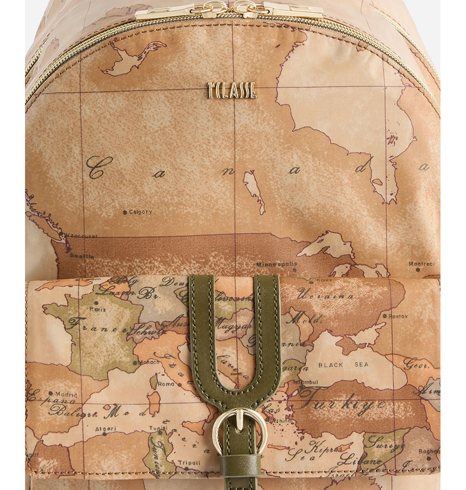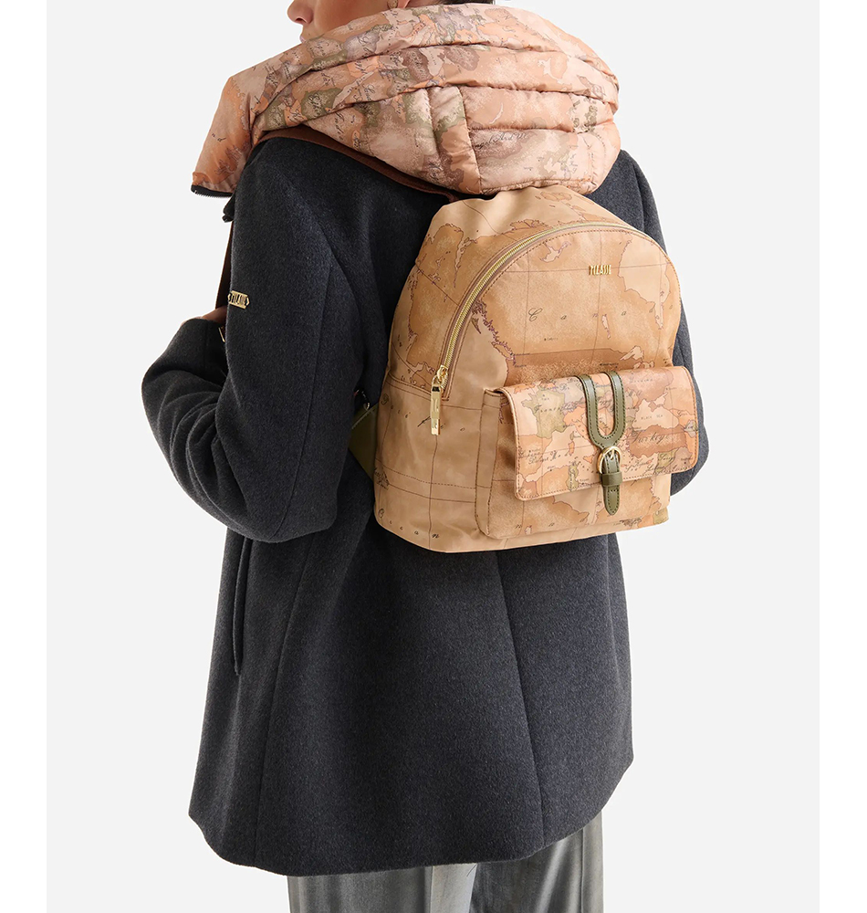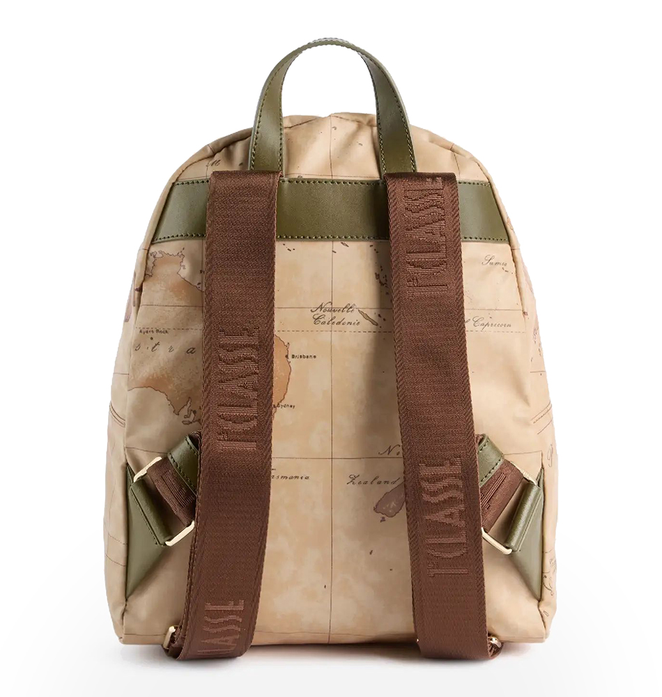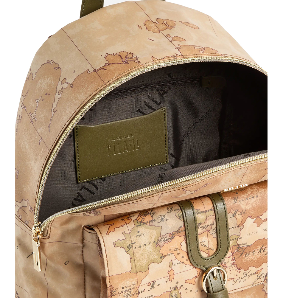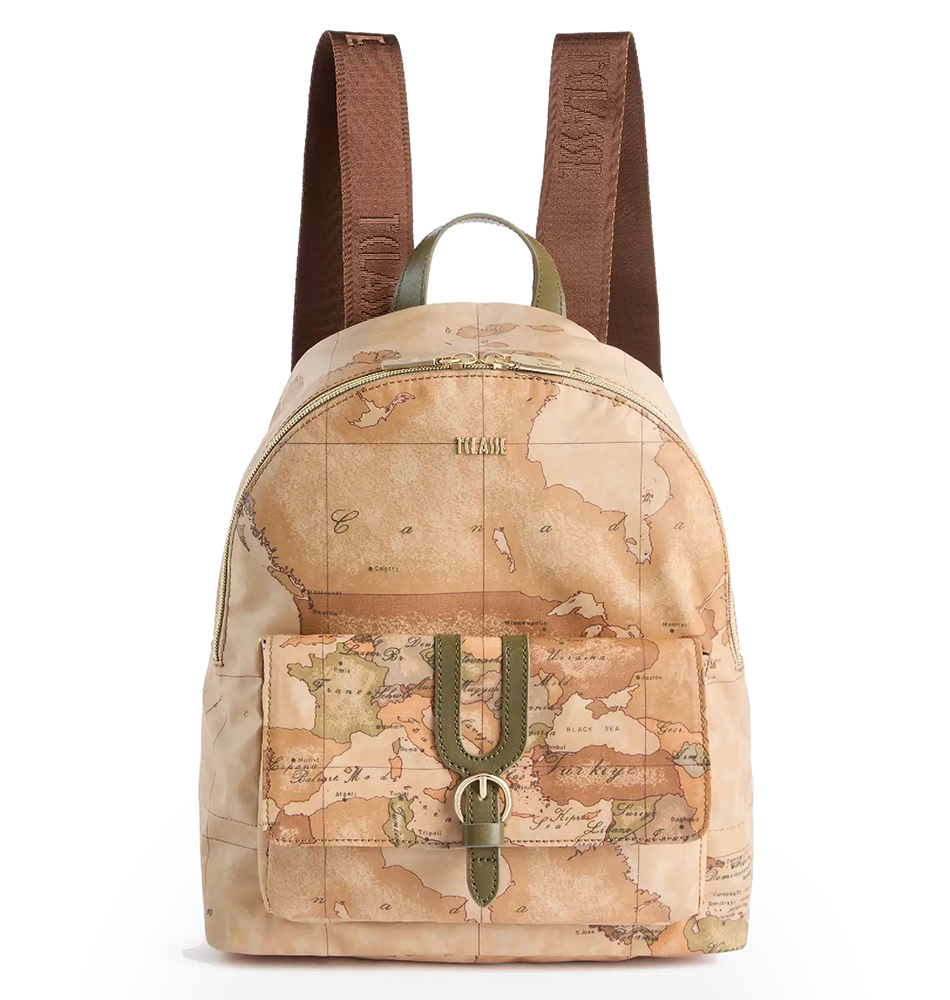 Γυναικείο σακίδιο Alviero Martini 1A Classe Highland LLD39-S578-0609 Ταμπά. Το σχέδιο Geo Classic μας μεταφέρει στα μαγευτικά Highlands της Σκωτίας, αναδεικνύοντας τη λειτουργικότητα και την ευελιξία του σακιδίου. Το εύκαμπτο και αδιάβροχο υλικό αναδεικνύεται από λεπτομέρειες σε απαλό χρυσό χρώμα, όπως το λογότυπο 1ᴬ Classe, και από τη λεπτομέρεια από απαλό δέρμα που διακοσμεί την μπροστινή τσέπη, με καμπύλες γραμμές εμπνευσμένες από τη γοτθική αρχιτεκτονική της Σκωτίας. Η μεγάλη χωρητικότητα και οι ρυθμιζόμενοι ιμάντες ώμου το καθιστούν έναν αξιόπιστο σύμμαχο για ταξίδια και βόλτες στην πόλη, χωρίς ποτέ να απομακρύνεται από το εμβληματικό style.