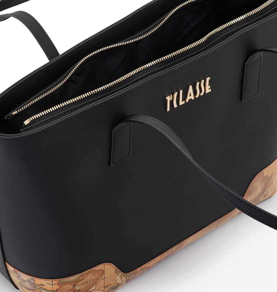 Γυναικεία τσάντα χειρός Alviero Martini 1A Classe Frost Geo LMLD96-9636-0001 Μαύρο. Ευρύχωρη και λειτουργική χάρη στο μαλακό rubberised ύφασμα, η τσάντα Frost Geo shopper εμπλουτίζεται με φαρδύ ένθετο από faux napa δέρμα με μοτίβο Geo Classic. Στο επάνω μέρος, το maxi λογότυπο 1ᴬ Classe σε απαλό χρυσό αναβαθμίζει το urban στυλ με την εμβληματική κομψότητα του brand. Οι άνετοι όγκοι διαθέτουν τρεις εσωτερικές θήκες, καθιστώντας την πολύτιμο σύμμαχο για τις απαιτητικές χειμερινές ημέρες.